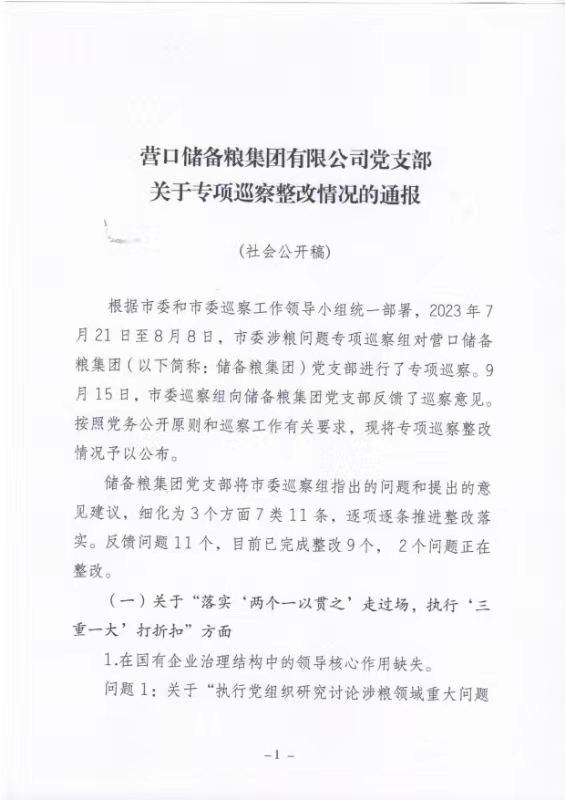 營口儲備糧集團有限公司黨支部關于專項巡察整改情況的通報